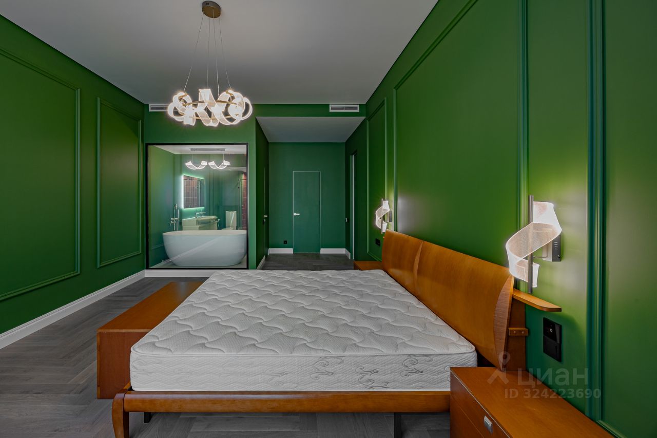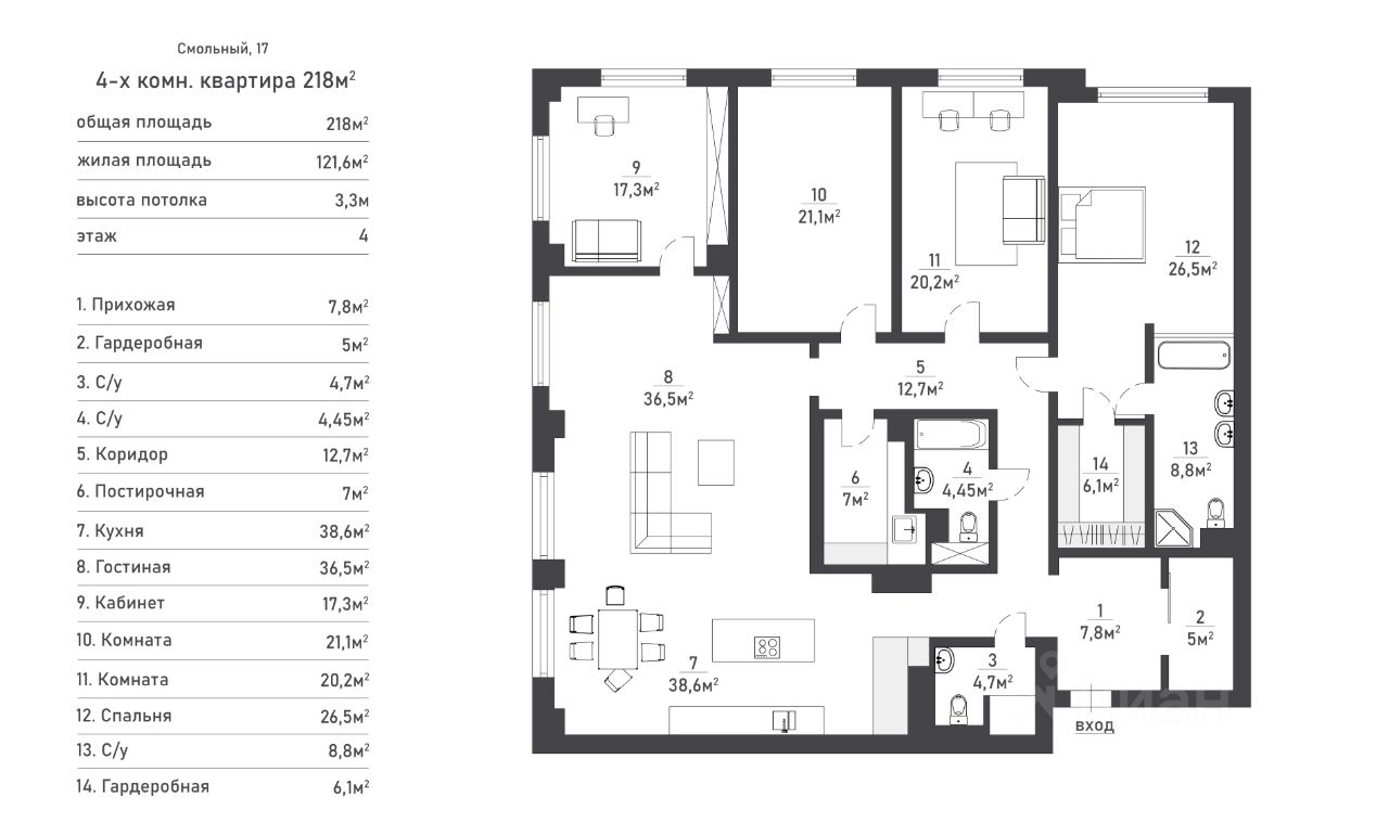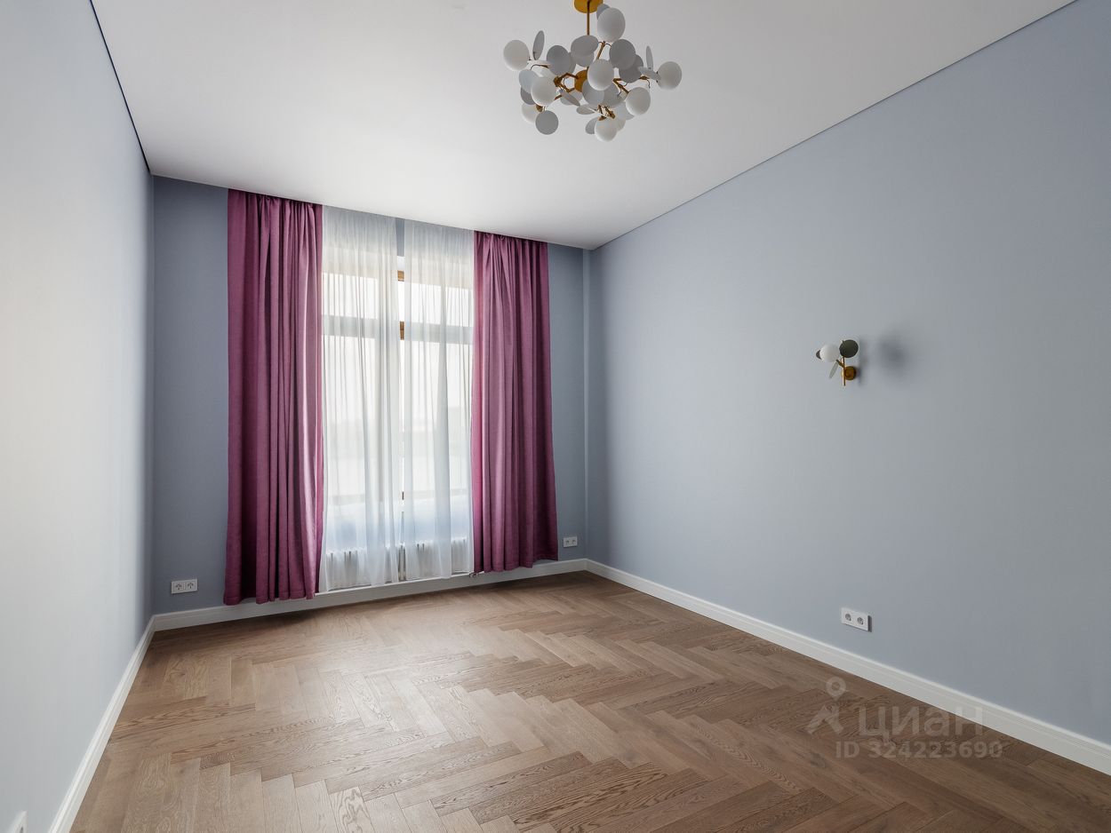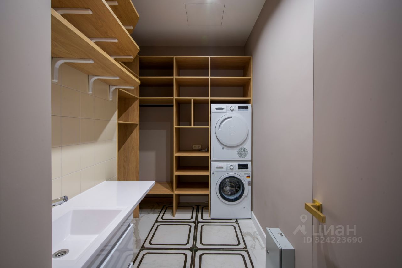 Планировка: - 3 спальни (возможно 4 спальни за счёт кабинета), - кабинет (опционально), - гостиная, совмещённая с кухнейстоловой, - 3 смежных санузла, - 2 гардеробные, - постирочная с местами для хранения вещей.