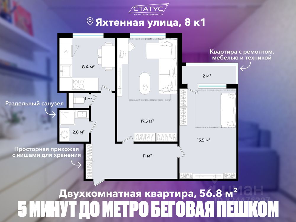 Функциональная двухкомнатная квартира общей площадью 56,8 м². Две изолированные комнаты (13,5 и 17,5 м²) легко зонируются под спальню, детскую или гостиную. Большая прихожая с нишами для хранения, раздельный санузел и остеклённая лоджия добавляют удобства. Квартира продается с готовым ремонтом, мебелью и бытовой техникой.