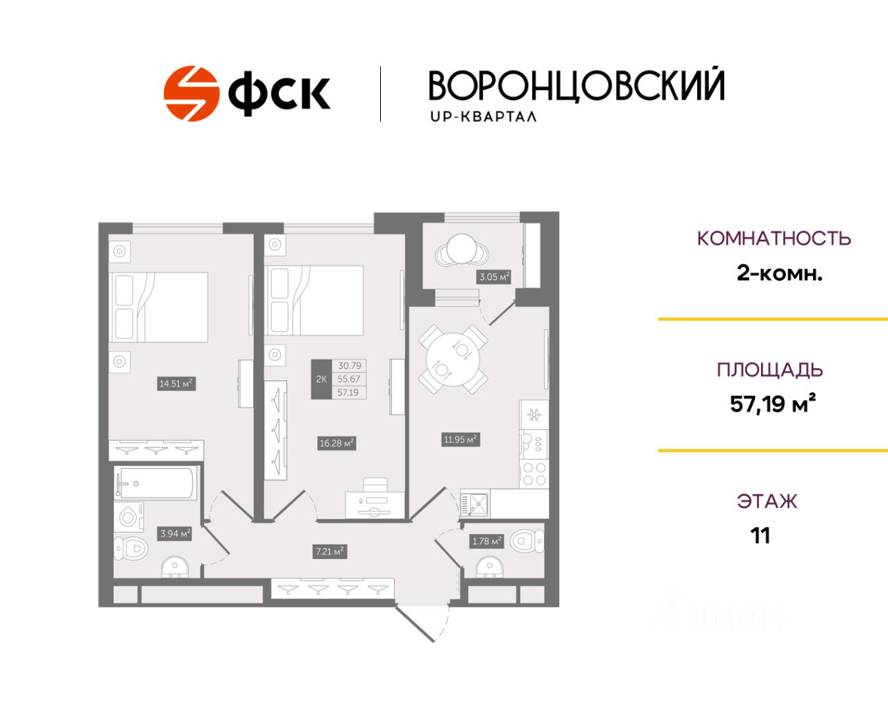 Цена со скидкой до 30% в прямой продаже от застройщика — только в этом месяце. Беспроцентная рассрочка. 2-к квартира в ЖК UP-квартал ''Воронцовский'' на 11-м этаже. Общая площадь 57,19. Чистовая отделка.
