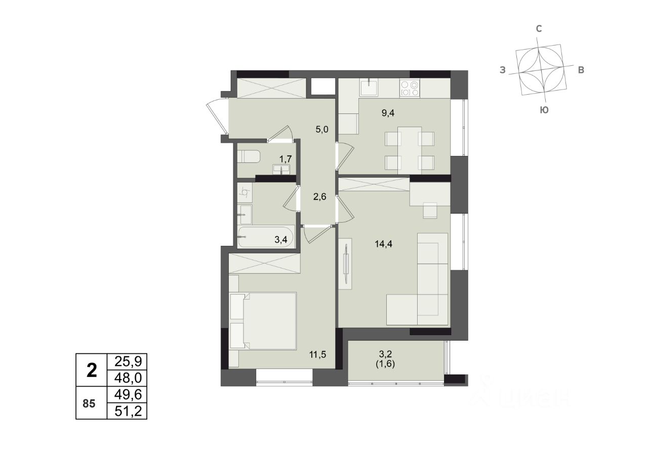 Общая площадь49,6 м2