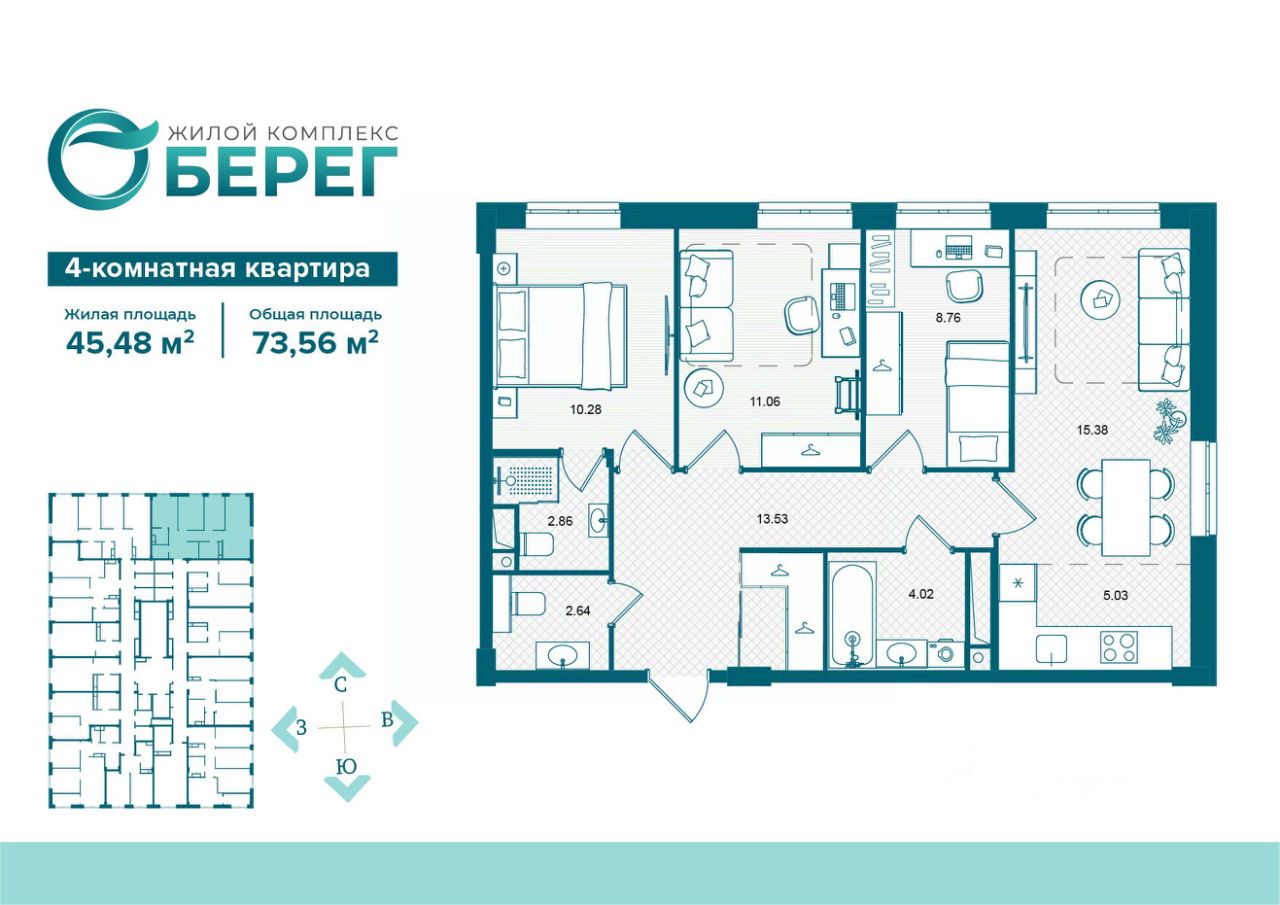 Продаётся 4-комнатная квартира в строящемся доме (поз.2), срок сдачи: IV-кв. 2027, общей площадью 73.56 кв.м., на 6 этаже. Современный жилой комплекс ЖК ''О' Берег'' на ул. Флотской, воплощает идею комфортной, доступной и продуманной городской среды. Комплекс расположен вблизи набережной, в экологически благоприятной зоне города. Панорамный вид на воду и зелёные аллеи усиливают ощущение уюта и создают атмосферу природной гармонии прямо в черте города.