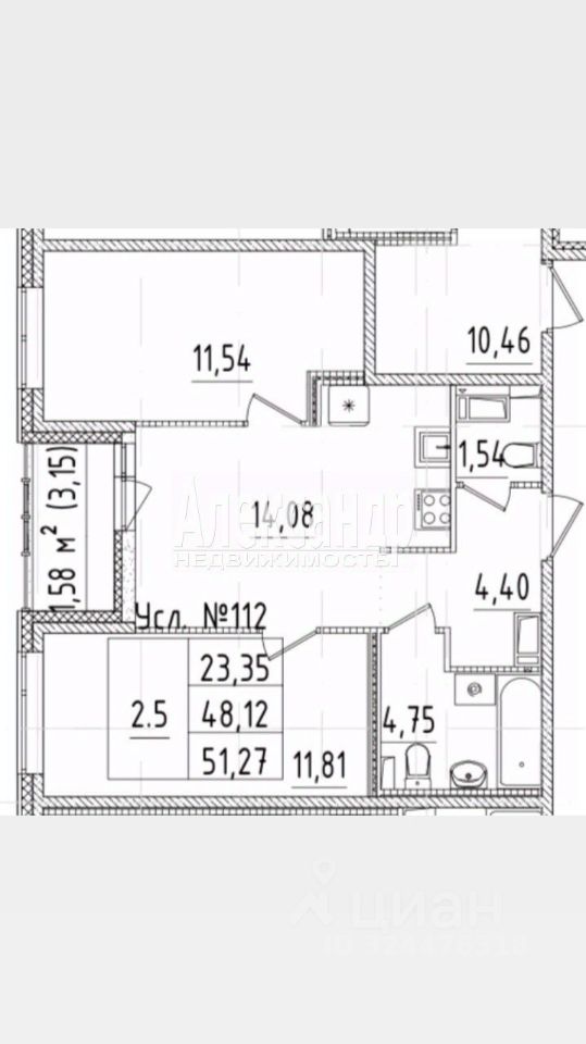 1705193 Продаётся квартира с двумя спальнями и большой кухней-гостиной (3 евро). Без отделки. Высокие потолки и увеличенные окна.
