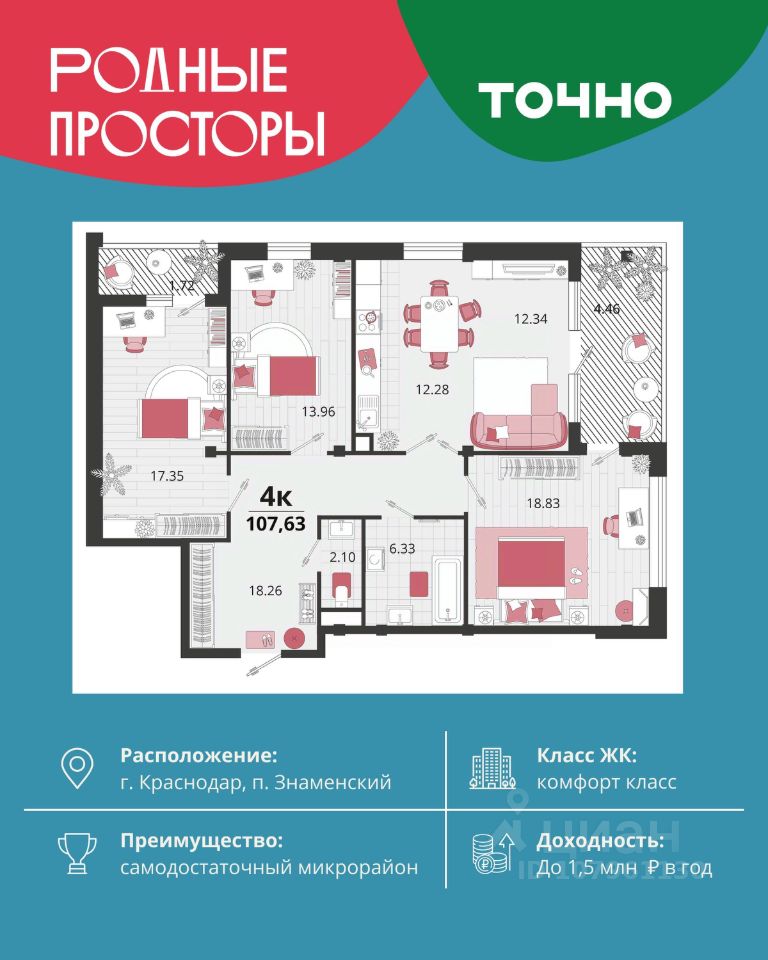 ''Родные просторы''- самодостаточный микрорайон, который реализован по принципу комплексного развития территории, где есть вся инфраструктура для комфортной жизни. На территории 41 га 29 домов от 9 до 24 этажей, уютные дворы со спортивными и игровыми площадками, социальные и коммерческие объекты, зеленые массивы и фонтаны. Главная точка притяжения ''Родных просторов'' - парк семейного отдыха площадью 9 га, 4,5 км прогулочных аллей, амфитеатр для мероприятий, кинофестивальная площадка. Особая гордость микрорайона современная школа на 1550 мест и 3 детских сада ''Ладушки'', ''Веснушки'' и ''Топотушки'' на 880 малышей. В центре микрорайона строятся фитнес-клуб BALANCE с акватермальным комплексом и собственная поликлиника, площадью более 5000 кв.м.