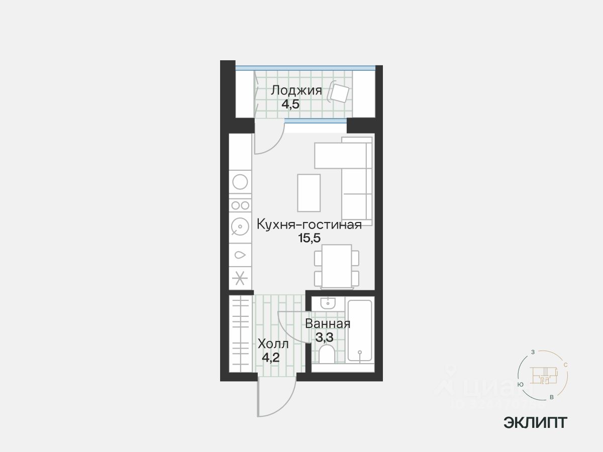 Студия с лоджией. Она с панорамным остеклением в пол. Кухню можете разместить в нише и отгородить спальное место перегородками.