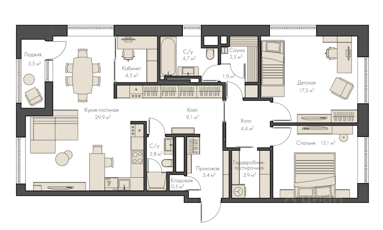 Функциональное планировочное решение включает в себя: кухню-гостиную, с выходом на застекленную лоджию, кабинет и две спальни, два совмещенных санузла и сауну, гардеробную-постирочную, а также - коридоры с продуманной системой хранения и кладовой - для лыж и сноубордов.