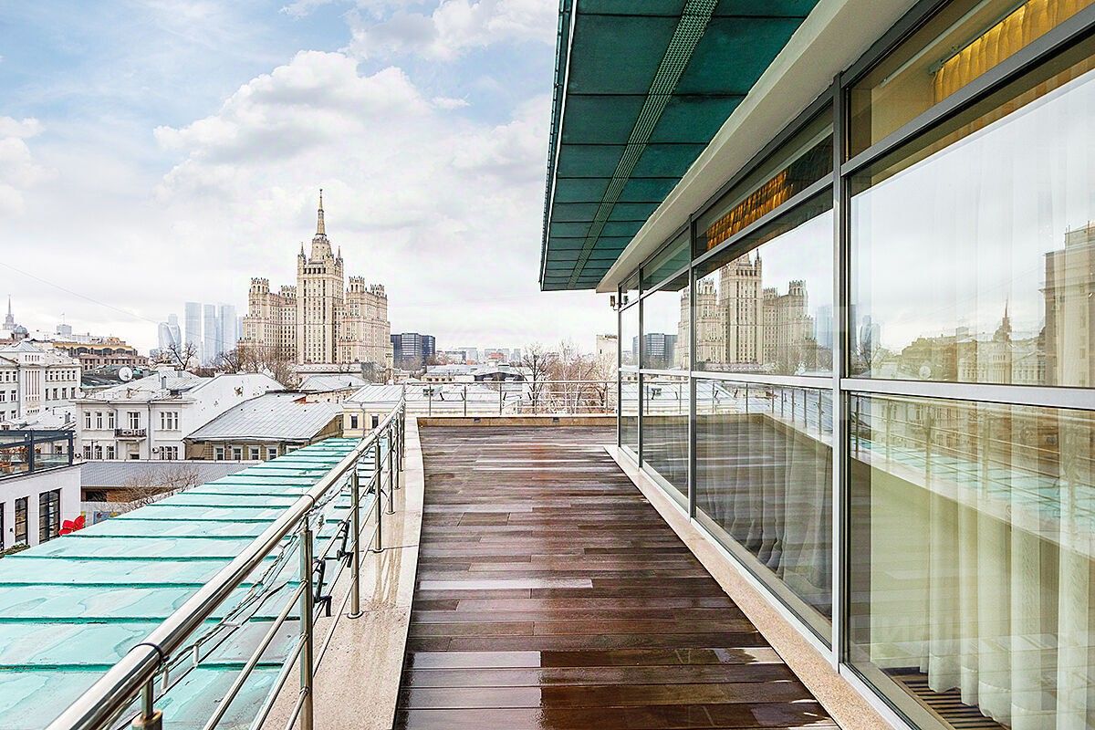 Много пространства, воздуха и света. Роскошная терраса по всему периметру с потрясающими видами на центр Москвы.