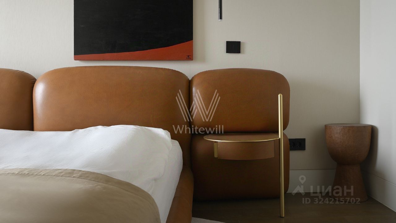 Апартаменты с двумя спальнями общей площадью 128 м² в комплексе премиум-класса ''Поклонная, 9'' на восемнадцатом этаже. Интерьер оформлен в современном стиле по авторскому дизайн-проекту, на полу выложены паркетная доска и плитка. Основной акцент создают панели из дерева и золотистые вставки. Просторные комнаты полностью укомплектованы мебелью и бытовой техникой.