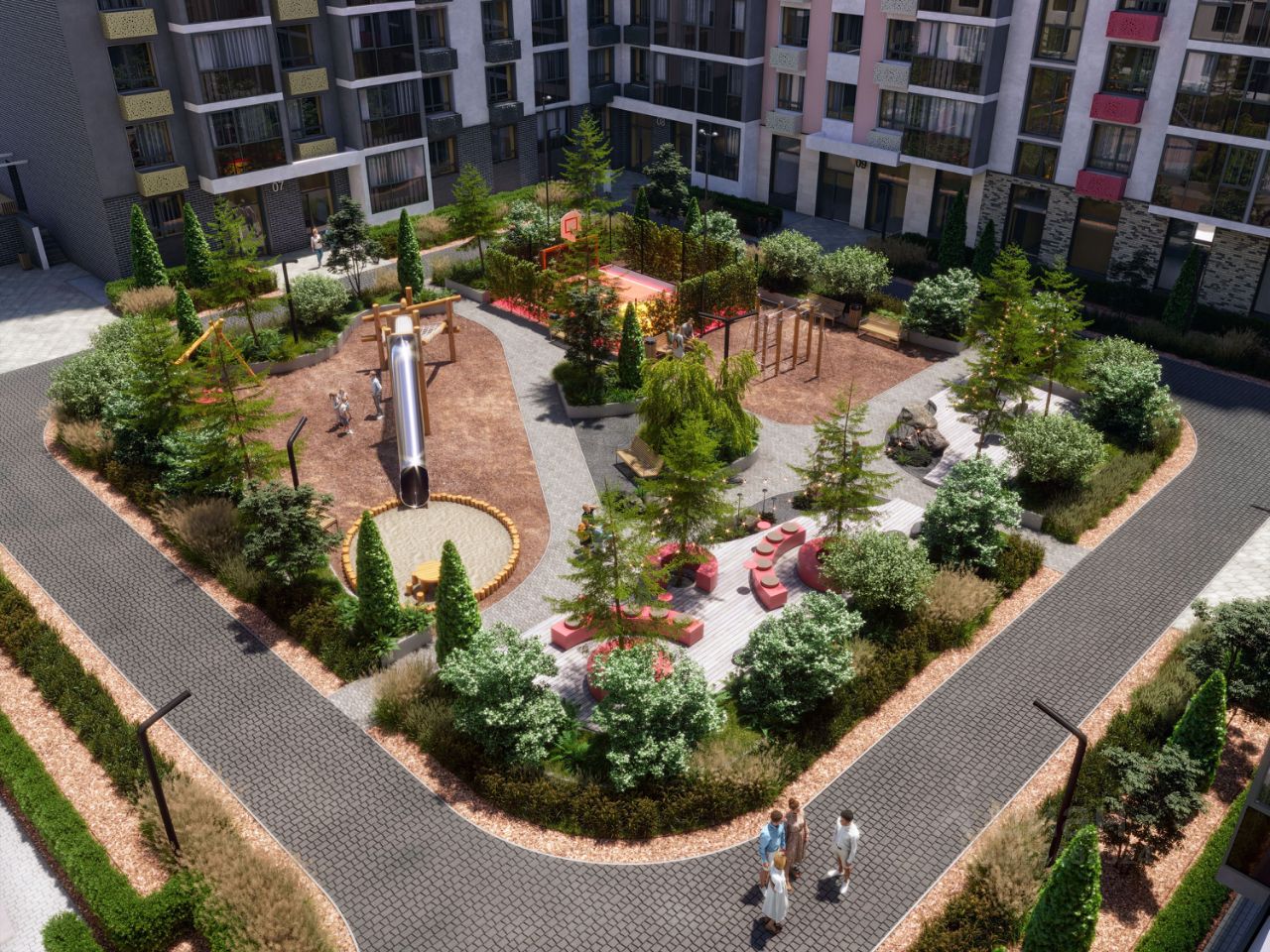 Благоустройство Новый центр притяжения - всесезонный сквер, выполненный в тематике и стилистике пермского периода. Прогулочные зоны, игровые и спортивные площадки, релакс-зоны и места для творчества - все эти мультифункциональные пространства формируют сценарии для любого досуга. Любители особой приватности оценят соседские террасы - это специальные пространства для жителей, расположенные прямо на стилобате паркинга. Любуйтесь на реку, принимайте участие в совместных мероприятиях с соседями, с удовольствием работайте на свежем воздухе и приятно проводите время с близкими.