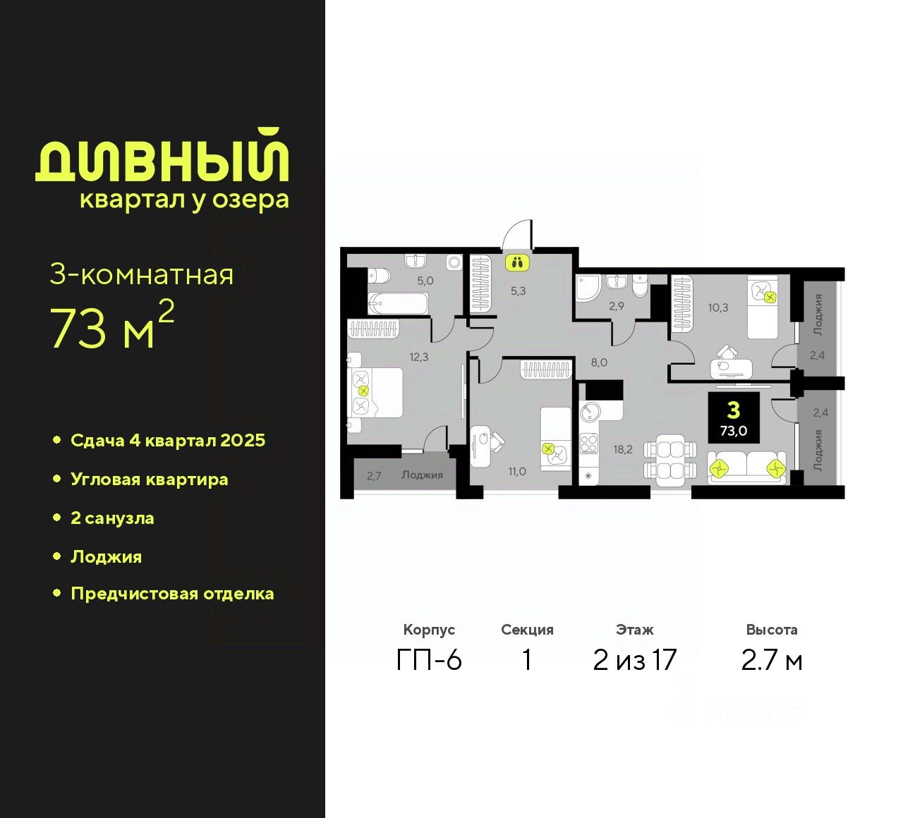 Просторная трехкомнатная квартира с предчистовой отделкой в ЖК ''Дивный квартал у озера'' на 2 этаже. Общая площадь: 73 кв.м., жилая: 33.5 кв.м., площадь просторной кухни-столовой: 18.2 кв.м. Квартира угловая, идеально подойдет любителям тишины и панорамных видов. В квартире две лоджии, два совмещенных санузла. Высота потолков 2.7 м.