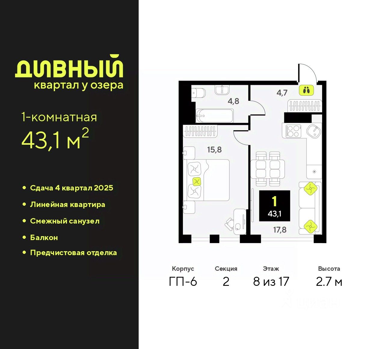 1-комн. квартира с предчистовой отделкой в ЖК ''Дивный квартал у озера'' на 8 этаже. Общая площадь: 43.1 кв.м., жилая: 14.9 кв.м., площадь просторной кухни-столовой: 17.6 кв.м. Все окна выходят на одну сторону. В квартире один балкон, один совмещенный санузел. Высота потолков 2.7 м.