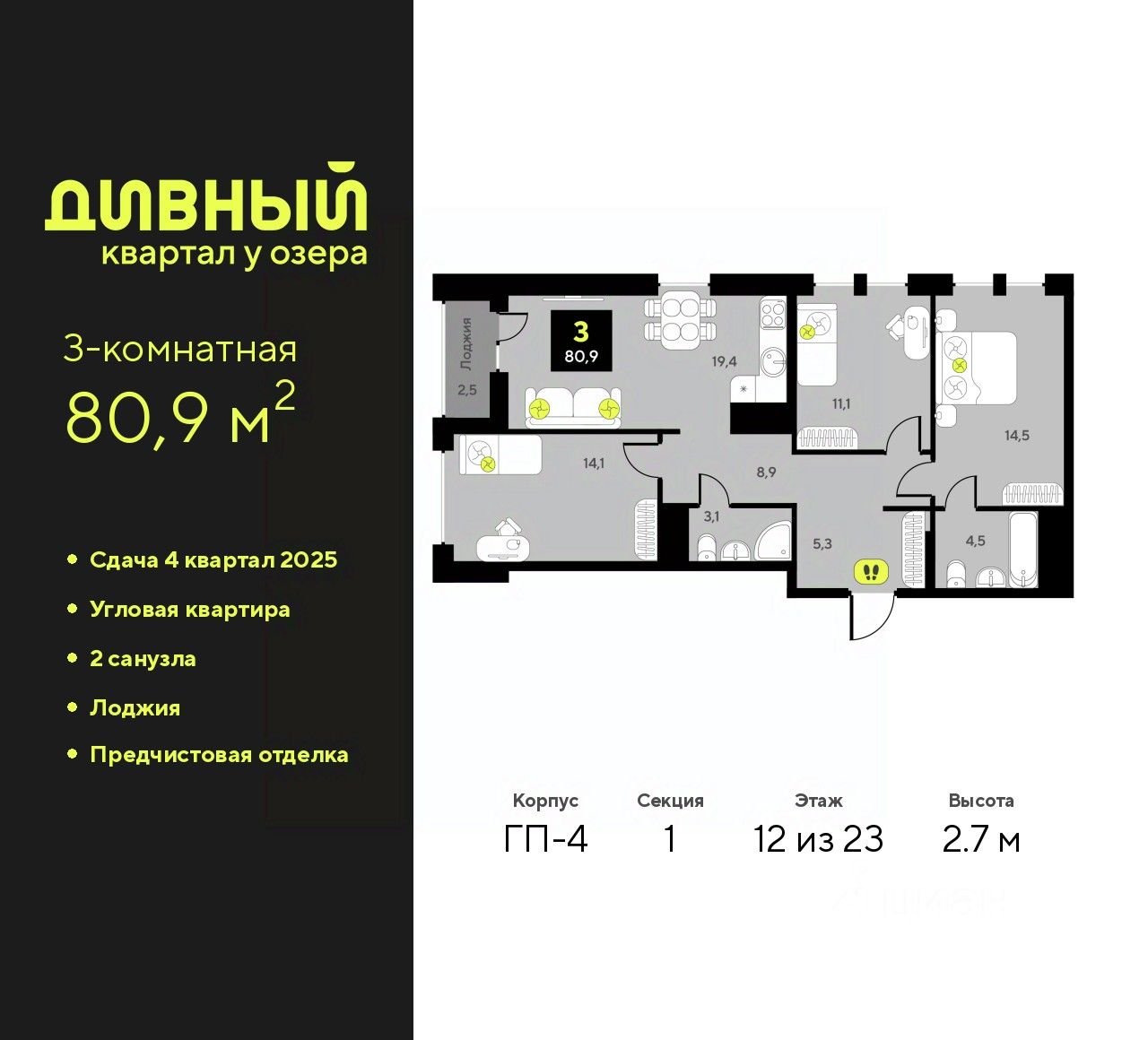 Трехкомнатная квартира с предчистовой отделкой в ЖК ''Дивный квартал у озера'' на 12 этаже. Общая площадь: 80.9 кв.м., жилая: 39.7 кв.м., площадь просторной кухни-столовой: 19.4 кв.м. Угловая квартира, идеально подойдет любителям тишины и панорамных видов. В квартире одна лоджия, два совмещенных санузла. Высота потолков 2.7 м.