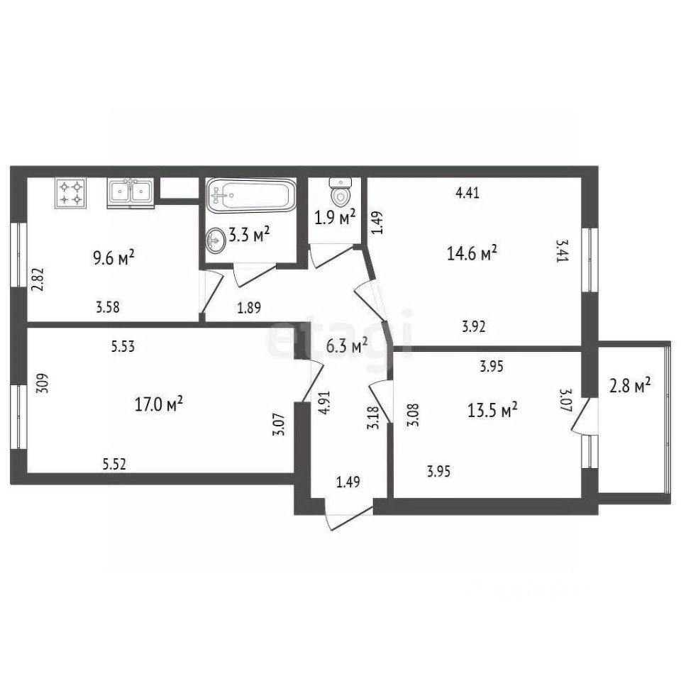 Эргономичная планировка: комната и кухня объединены в просторную кухню-гостиную 26,6 кв.м., 2 изолированные комнаты 14,6 и 13,5 кв.м, лоджия 2,8 кв.м