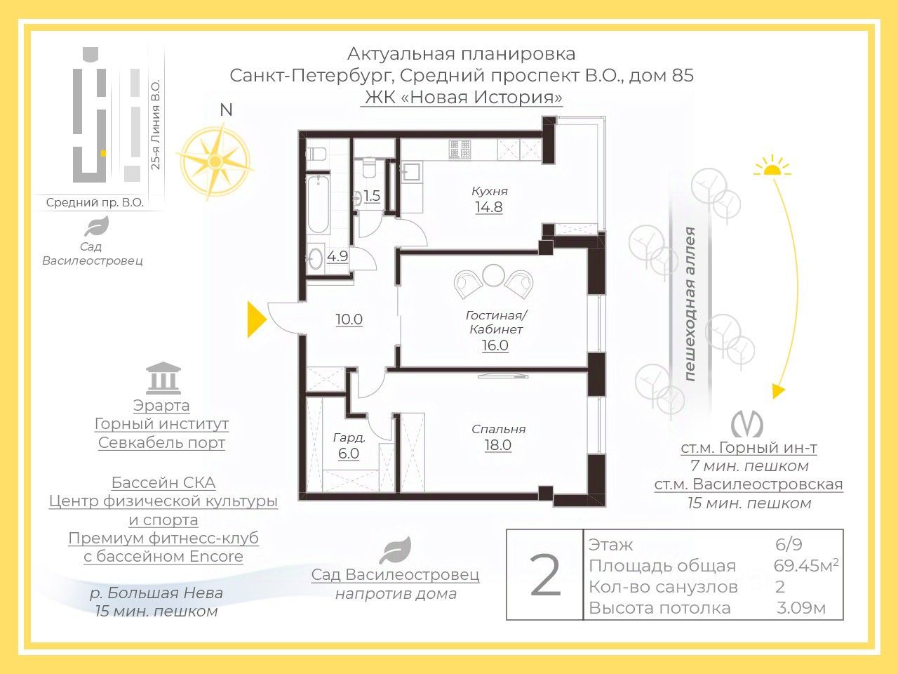 До метро Горный институт 7 минут пешком. Погулять можно в саду Василеостровец который находится напротив ЖК. В 5 минутах пешком находится Бассейн СКА, Центр физической культуры и спорта, премиум фитнесс клуб с бассейном Encore. Отличная транспортная доступность.