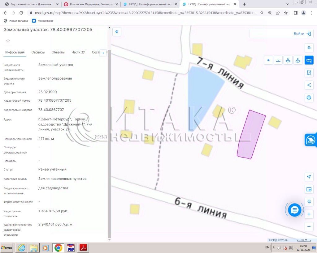 2-17630 В СПб, Торики, в садоводстве ''Дружный-1'', 7-я линия, уч. 24, в 25 мин. до м.Ветеранов, продаётся земельный участок 471 кв.м, кадастровый номер 78:40::205, прямоугольной формы.