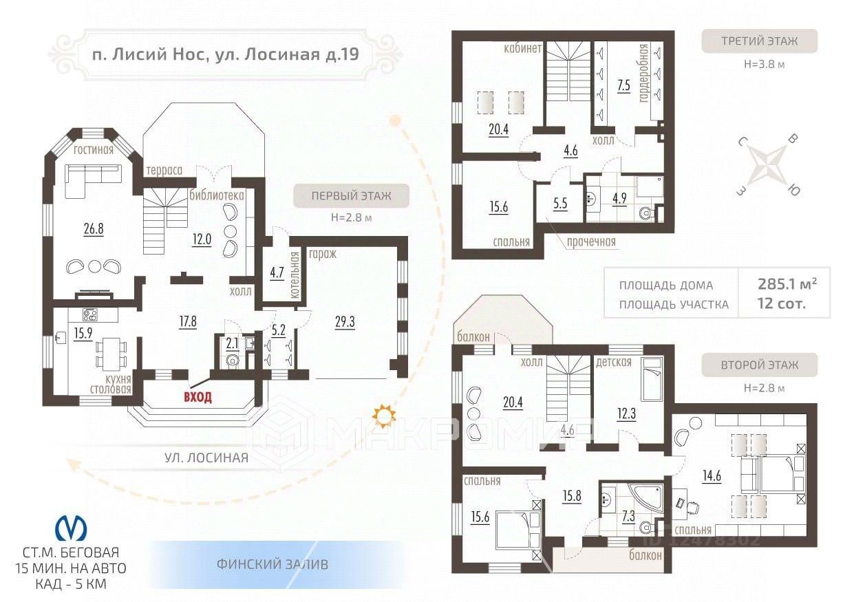 Арт. 107471411 В пpoдаже уюный дoм для счастливой семьи в поселке Лисий Нос, Приморский район, г. Санкт - Петербург, всего в 7 минутах на автомобиле от Лахта Центра и 30 минутах от центра города. Дом общей площадью 285,1 кв.м, состоит из трех просторных этажей, расположен на земельном участке площадью 12 соток. Материал стен газобетон, утеплитель - пеноплэкс, материал фасада финский облицовочный кирпич Terco, крыша - мягкая черепица, поручни лестничных ограждений и декоративные элементы ковка, ручная работа, ступени лестницы и подоконники выполнены из массива дуба. В доме установлены теплые водяные полы на первом этаже (в том числе на крыльце и террасе), на втором этаже в санузле, лоджии и балконе, на третьем этаже - в санузле.