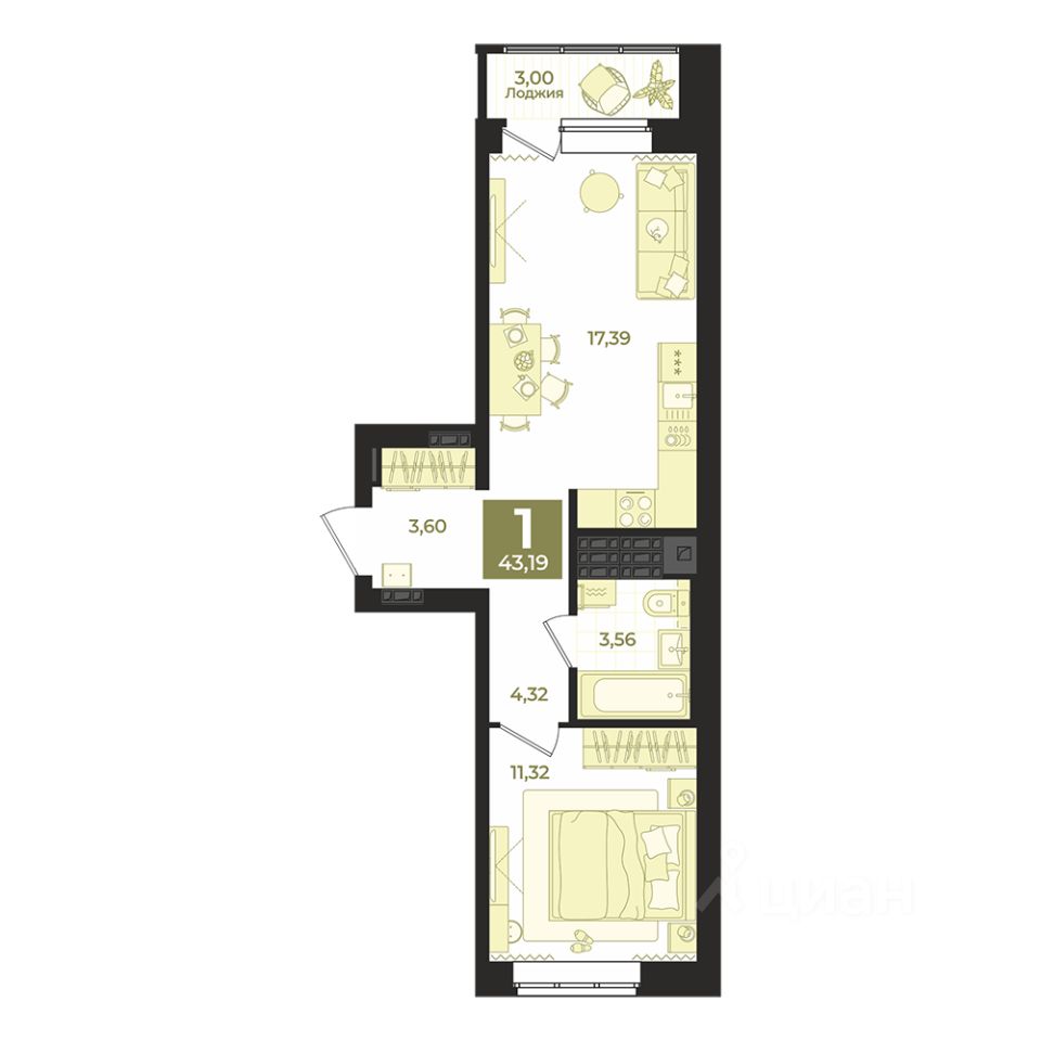 Общая площадь43,19 м2