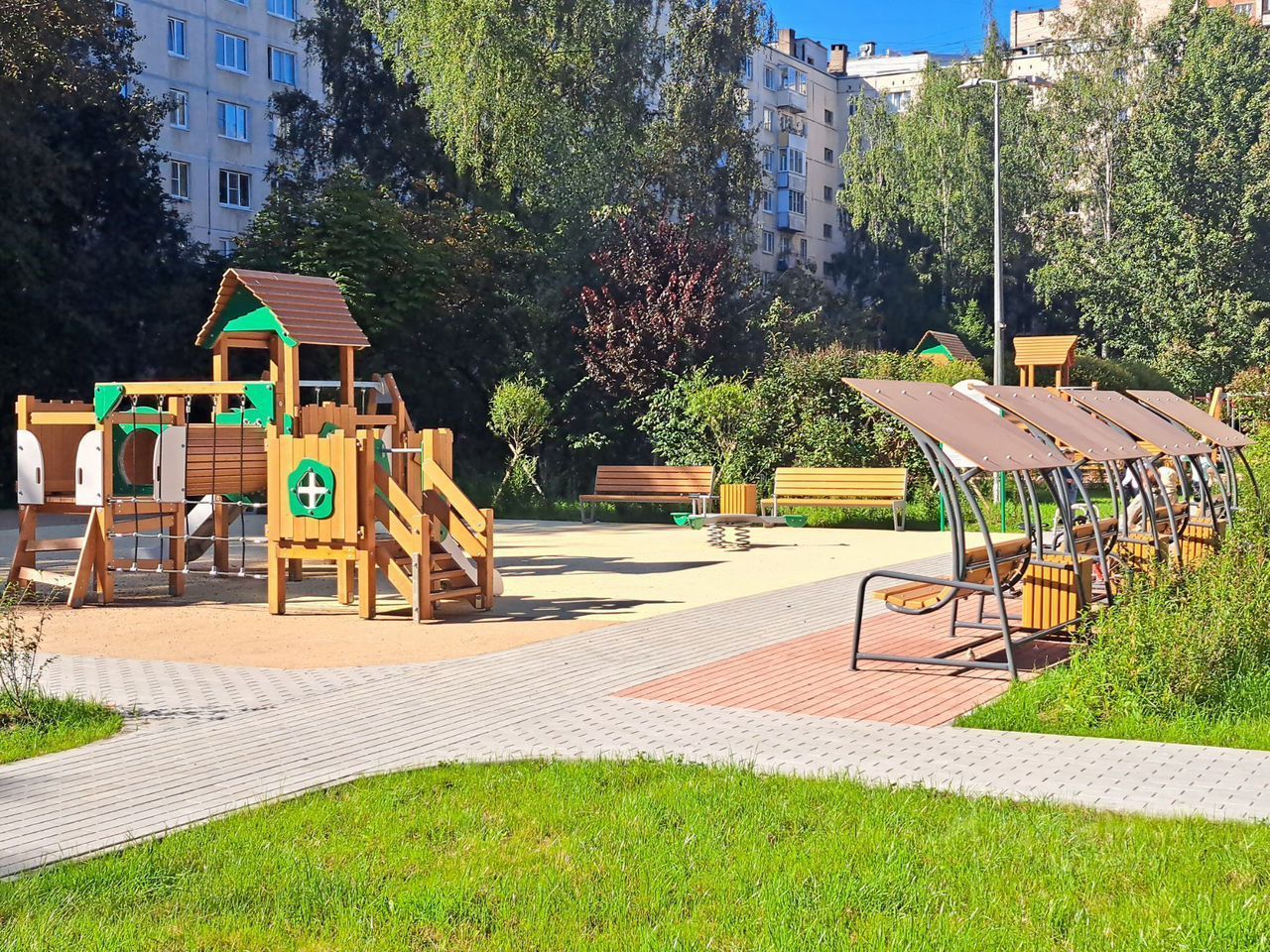 Во дворе дома оборудована современная детская площадка для детей разных возрастов, установлены лавочки.