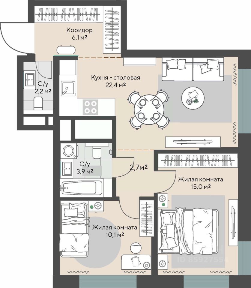 Продаётся 2-комнатная квартира в строящемся доме (Дом 1 этап 1.1), срок сдачи: I-кв. 2028, общей площадью 62.6 кв.м., на 3 этаже.
