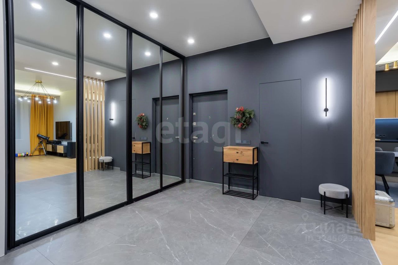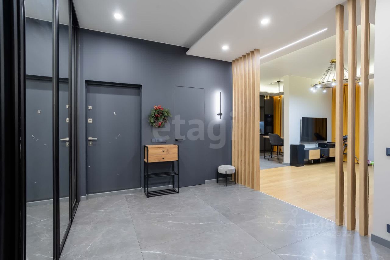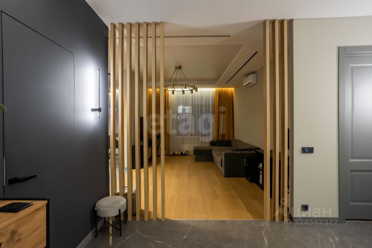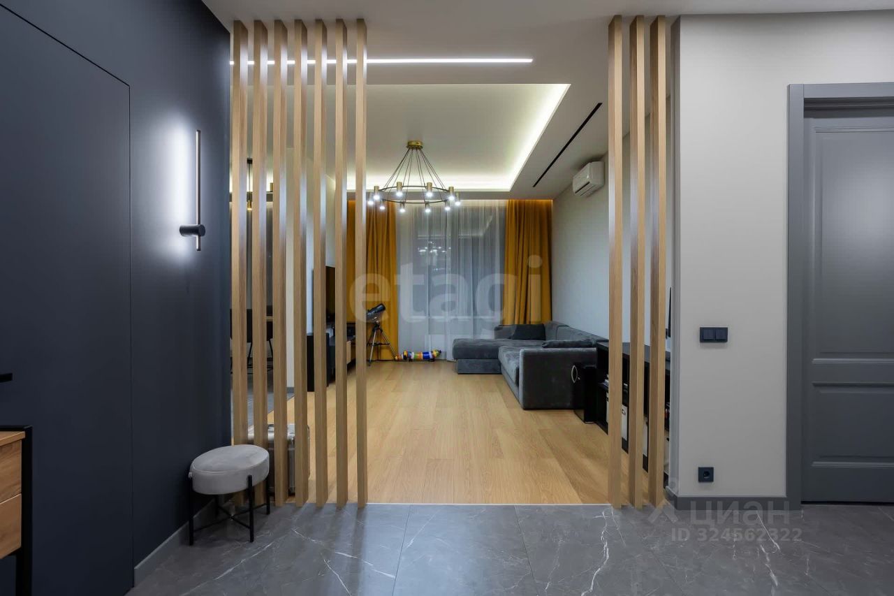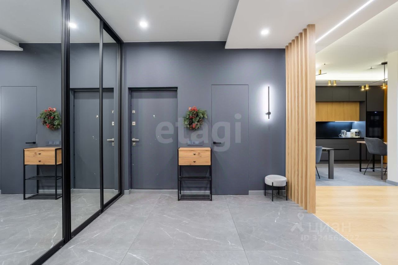Что делает эту квартиру особенной? Индивидуальный дизайн-проект в современном стиле: — Огромный зеркальный шкаф-гардероб в коридоре, визуально расширяющий пространство — Высокие двери и деревянные рейки на входе в гостиную — подчеркивают высоту потолков и добавляют уюта — Скрытые шторы с диодной подсветкой и LED-освещение по всей квартире — для атмосферного света в любое время суток