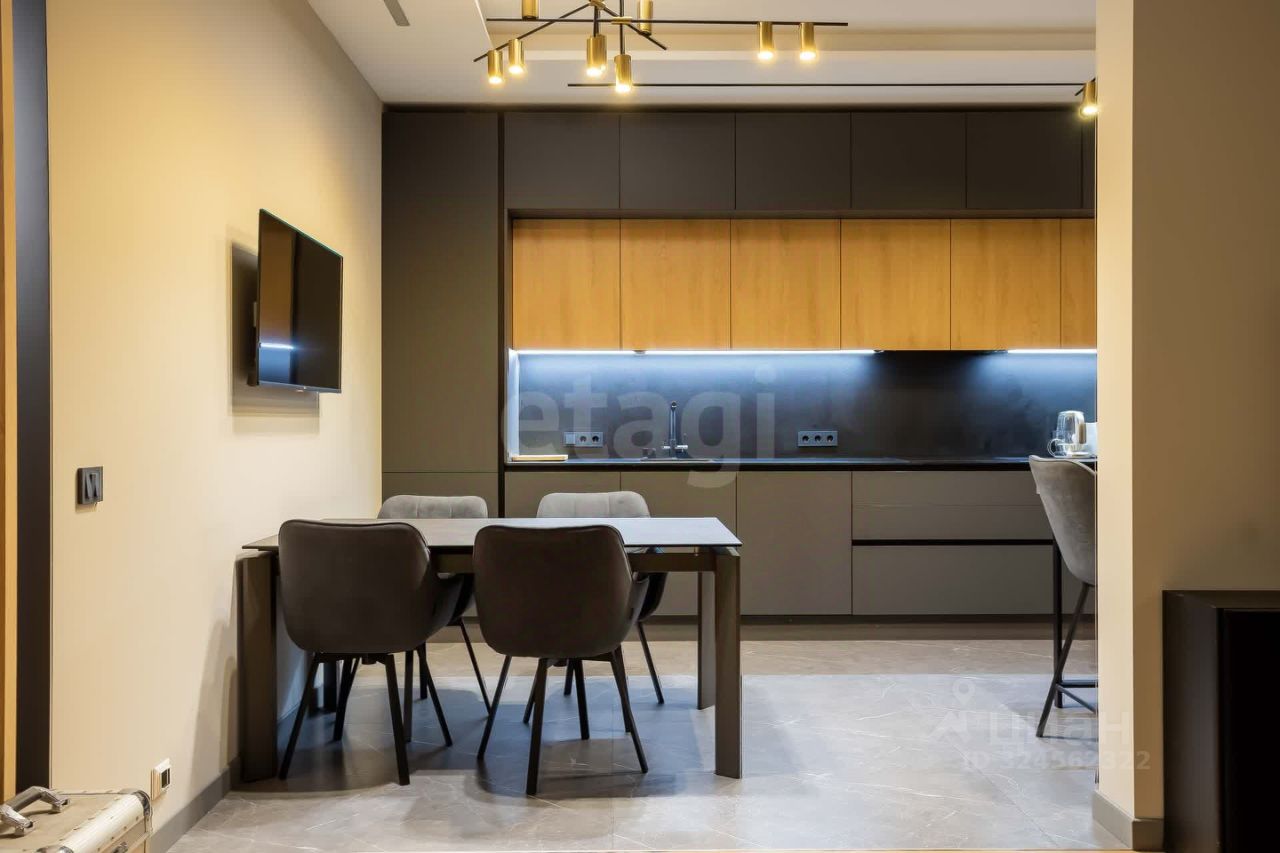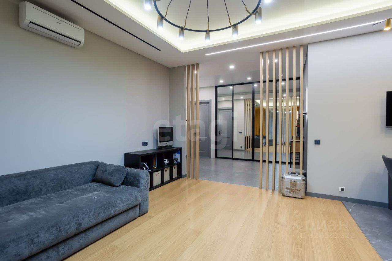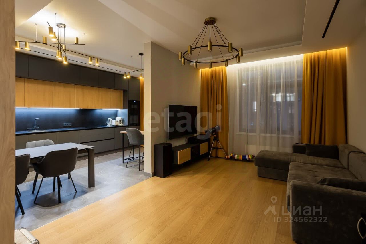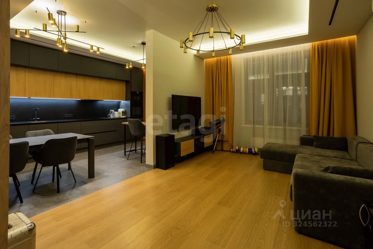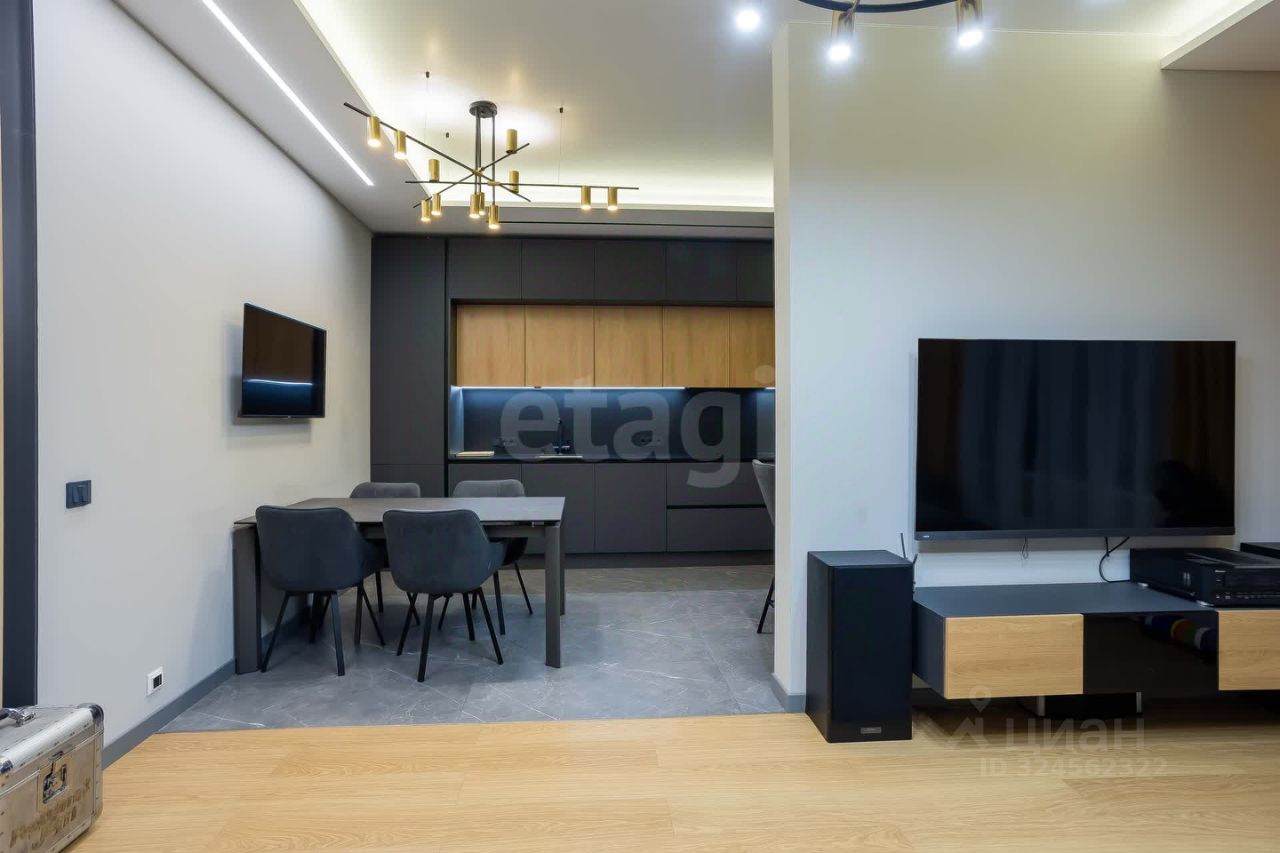 Что делает эту квартиру особенной? Индивидуальный дизайн-проект в современном стиле: — Огромный зеркальный шкаф-гардероб в коридоре, визуально расширяющий пространство — Высокие двери и деревянные рейки на входе в гостиную — подчеркивают высоту потолков и добавляют уюта — Скрытые шторы с диодной подсветкой и LED-освещение по всей квартире — для атмосферного света в любое время суток