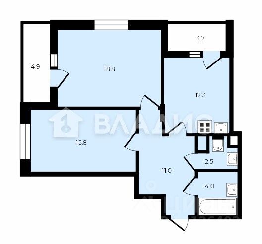 Характеристики квартиры: • Общая площадь 64,4 м²(+ лоджии 8,6 м²) • Спальни 18,8 м² + 15,8 м² • Кухня 12,3 м² с выходом на лоджию • Высота потолков 2,60 • Раздельный просторный санузел