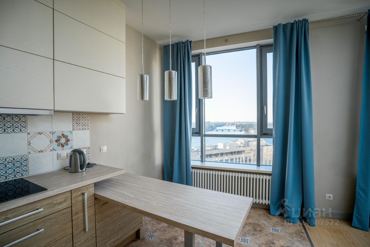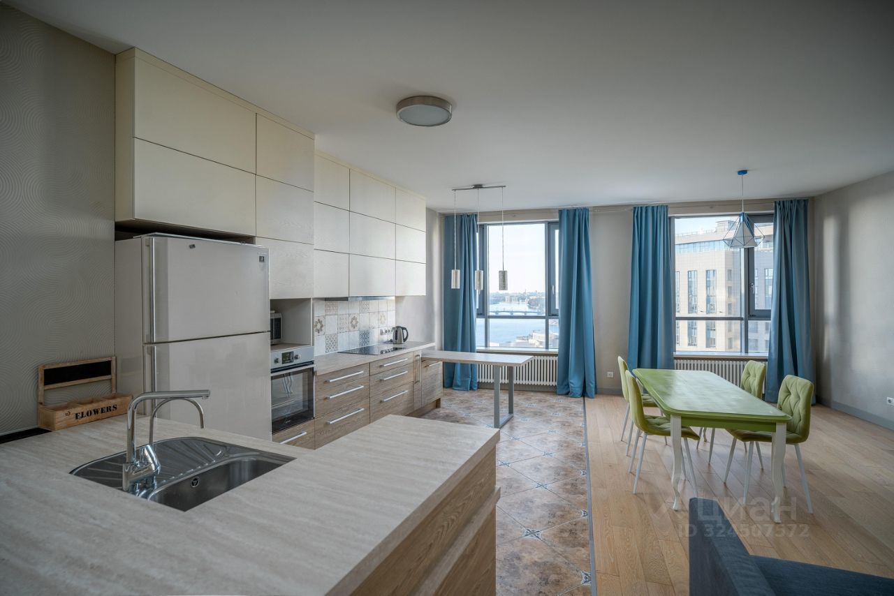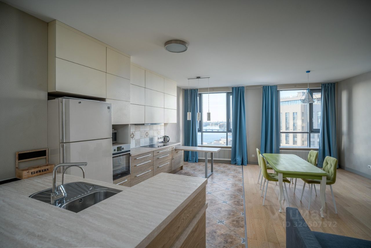 Основные характеристики:общая площадь: 120 м²,2 изолированные комнатыпросторная кухнягостиная,лоджия,Вся необходимая бытовая техника. Достаточно мест для хранения вещей,большие окна — отличная освещённость и панорамные виды на Неву,высокие потолки и просторные помещения.