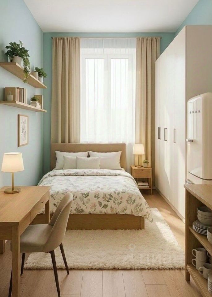 Комната имеет вид вытянутого прямоугольника, что позволяет удобно её зонировать: на входе организовать кухонную с холодильником зону, а ближе к окну - жилую.