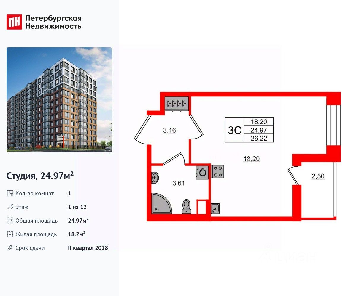 Удобная, классическая, функциональная европланировка, вместительная прихожая 3.16 м². Общая площадь студии - 24.97 м², жилая 18.2 м², высота потолка 2.77 м.