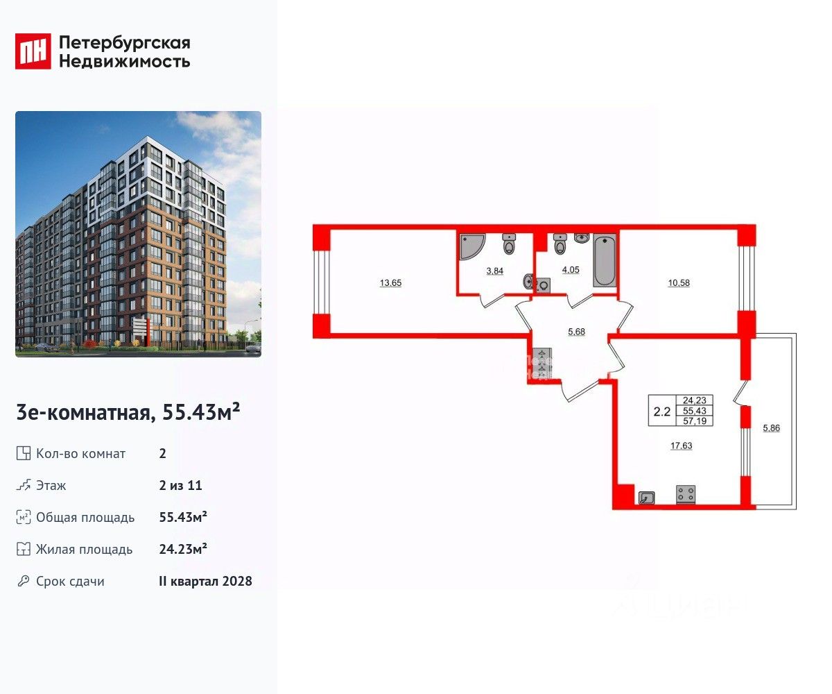 Удобная, классическая, функциональная европланировка, большая кухня-гостиная 17.63 м², вместительная прихожая 5.68 м². Общая площадь квартиры - 55.43 м², жилая 24.23 м², высота потолка 2.77 м.