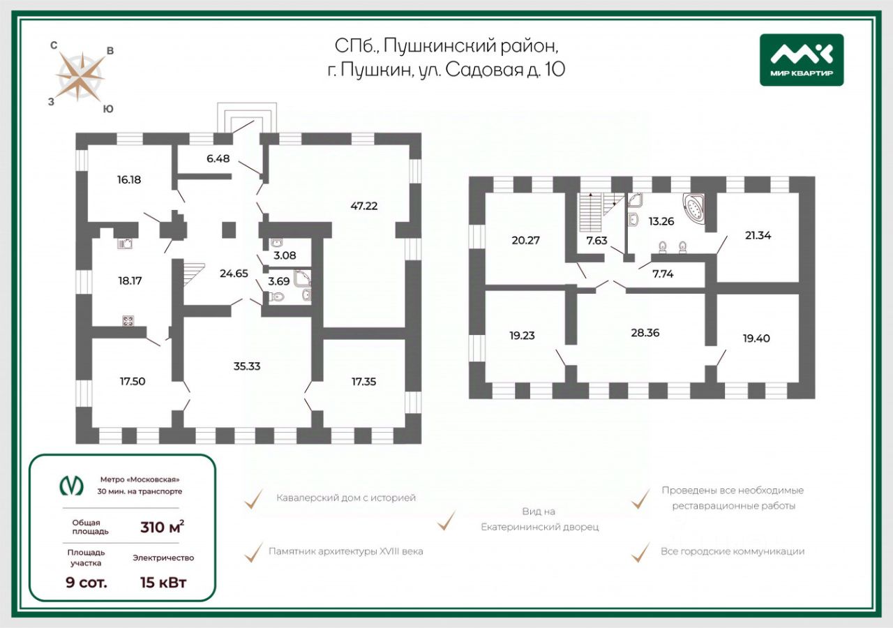 Авторство великих зодчих: Первоначальный проект — С.И. Чевакинский, перестройка — И.В. Неелов. Это дом с характером и подлинными деталями барокко! Простор и свет: Высота потолков от 3,2 до 3,7 метра создает ощущение простора и величия. Площадь особняка — 310 кв.м. Эксклюзивная локация: Садовая улица, вид на парк, престижный и экологически чистый район. Ваши соседи — история и величие. Полная профессиональная реставрация, все городские коммуникации (включая газ), собственный земельный участок. Без отделки — чистый холст для воплощения любого дизайнерского проекта.
