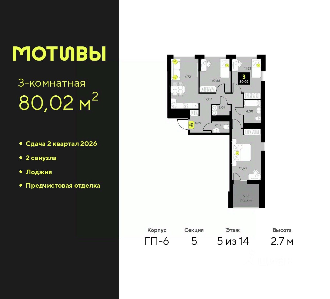 Просторная трехкомнатная квартира с предчистовой отделкой в ЖК ''Мотивы'' на 5 этаже. Общая площадь: 80.02 кв.м., жилая: 37.95 кв.м., площадь просторной кухни-столовой: 14.72 кв.м. Квартира без проходных комнат, окна выходят нa три cтopoны дома. В квартире одна лоджия, один совмещенный и один раздельный санузел. Высота потолков 2.7 м.