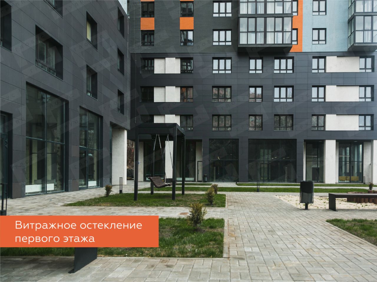 3. Прозрачные двери в подъезды - пространство наполнено светом и объёмом, а жители видят, что происходит внутри подъезда и снаружи во дворе