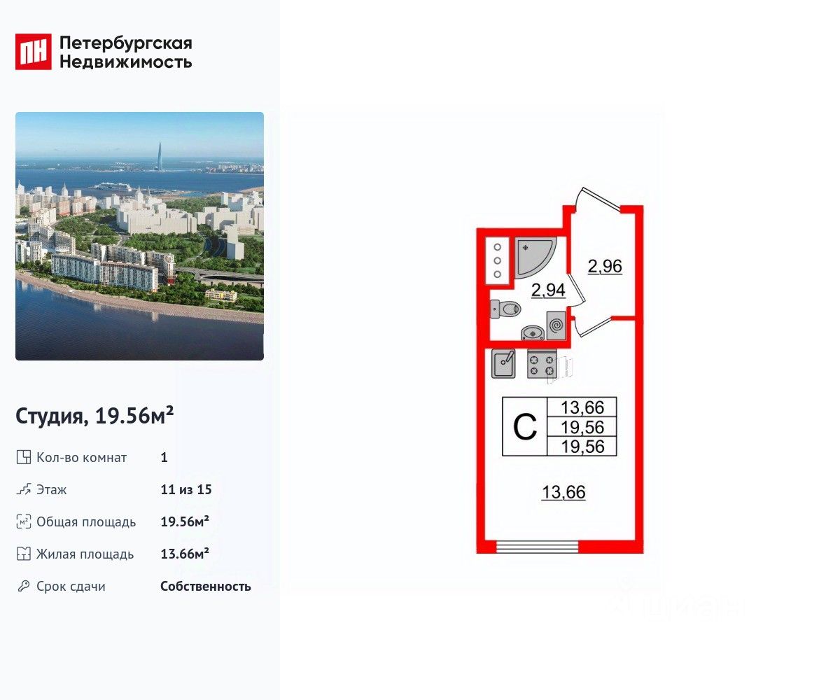 Удобная, классическая, функциональная европланировка, вместительная прихожая 2.96 м². Общая площадь студии - 19.56 м², жилая 13.66 м², высота потолка 2.7 м.