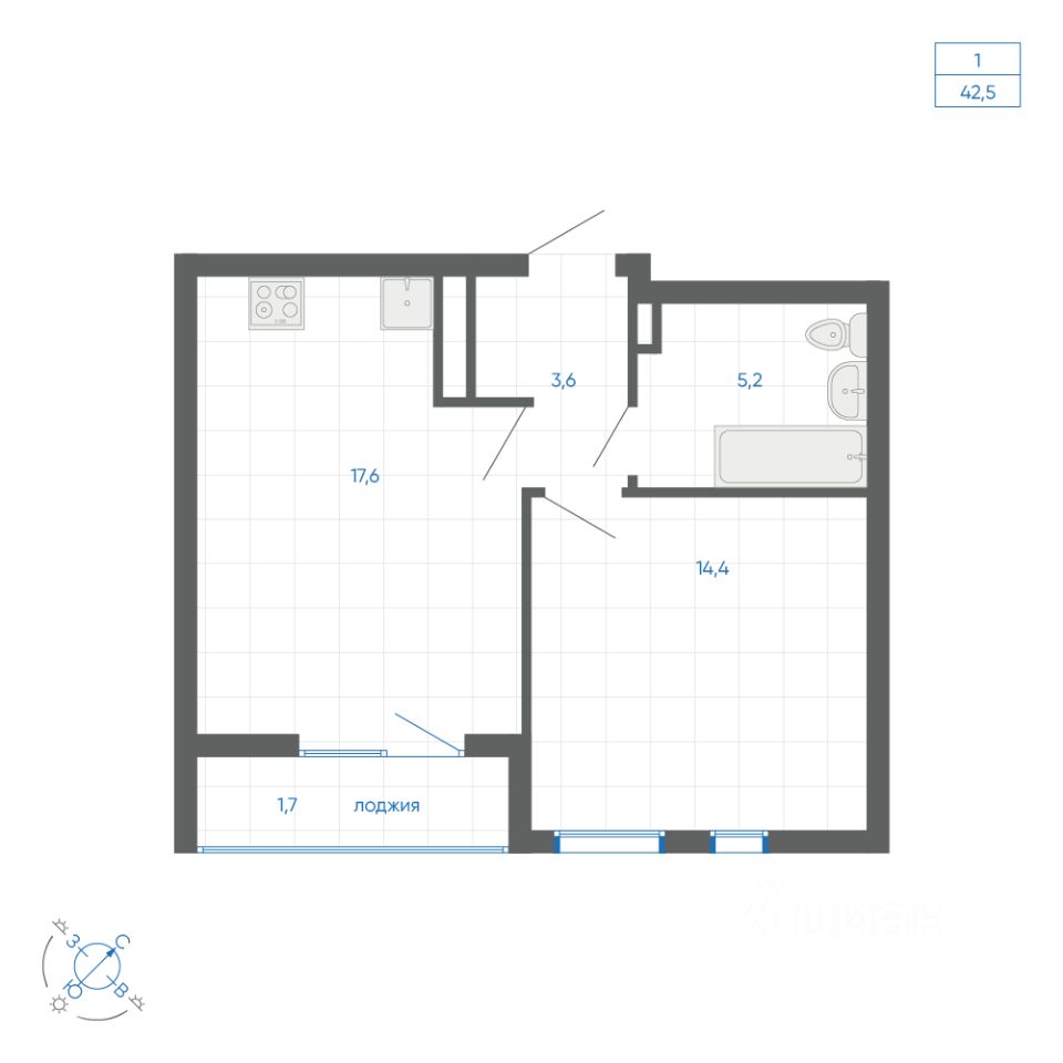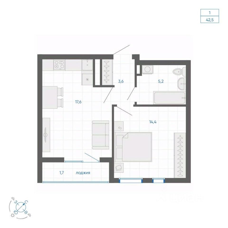 Общая площадь42,5 м2