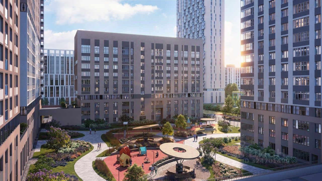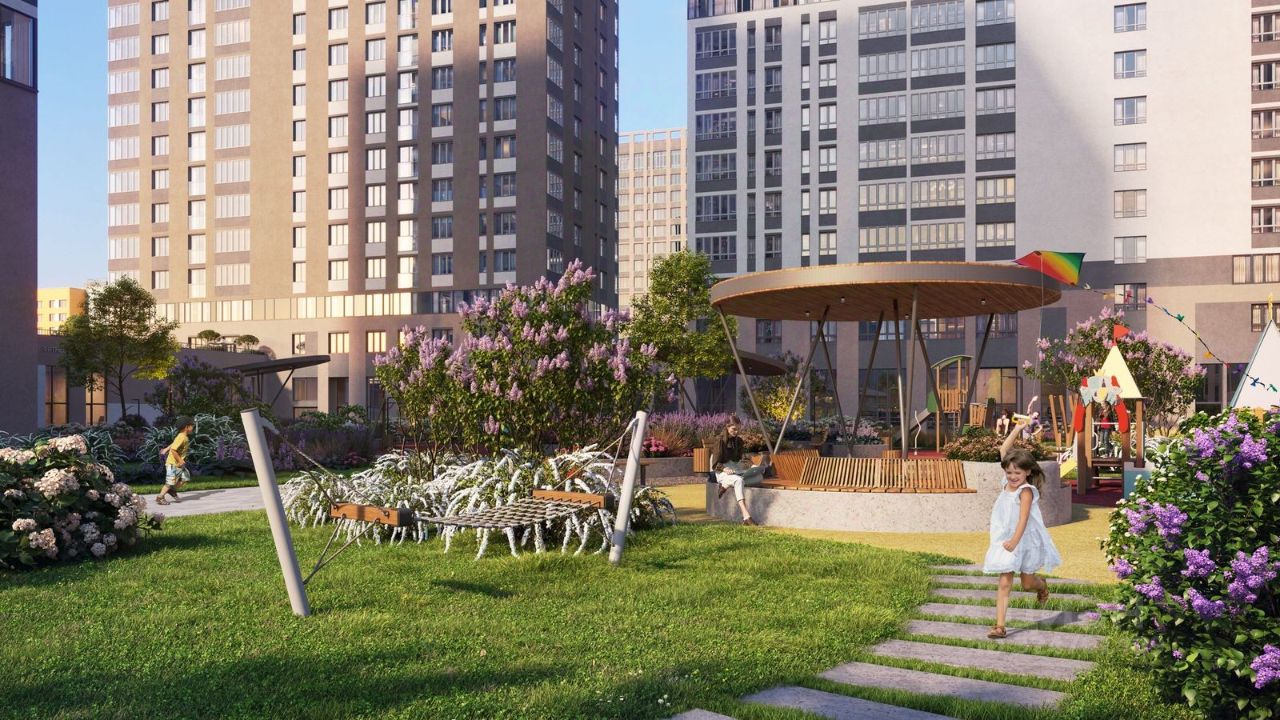 Четыре секции разной этажности ЖК First образуют закрытую дворовую территорию, обеспечивая комфорт и безопасность. Ландшафтное озеленение создаст атмосферу уюта, а живые изгороди отделят детскую зону от зоны отдыха с кроссбукингом. Благодаря переменной высотности от 10 до 32 этажей во дворе всегда много солнечного света. В проекте предусмотрены детские игровые комплексы по возрастам, места для отдыха всей семьей и занятий спортом.