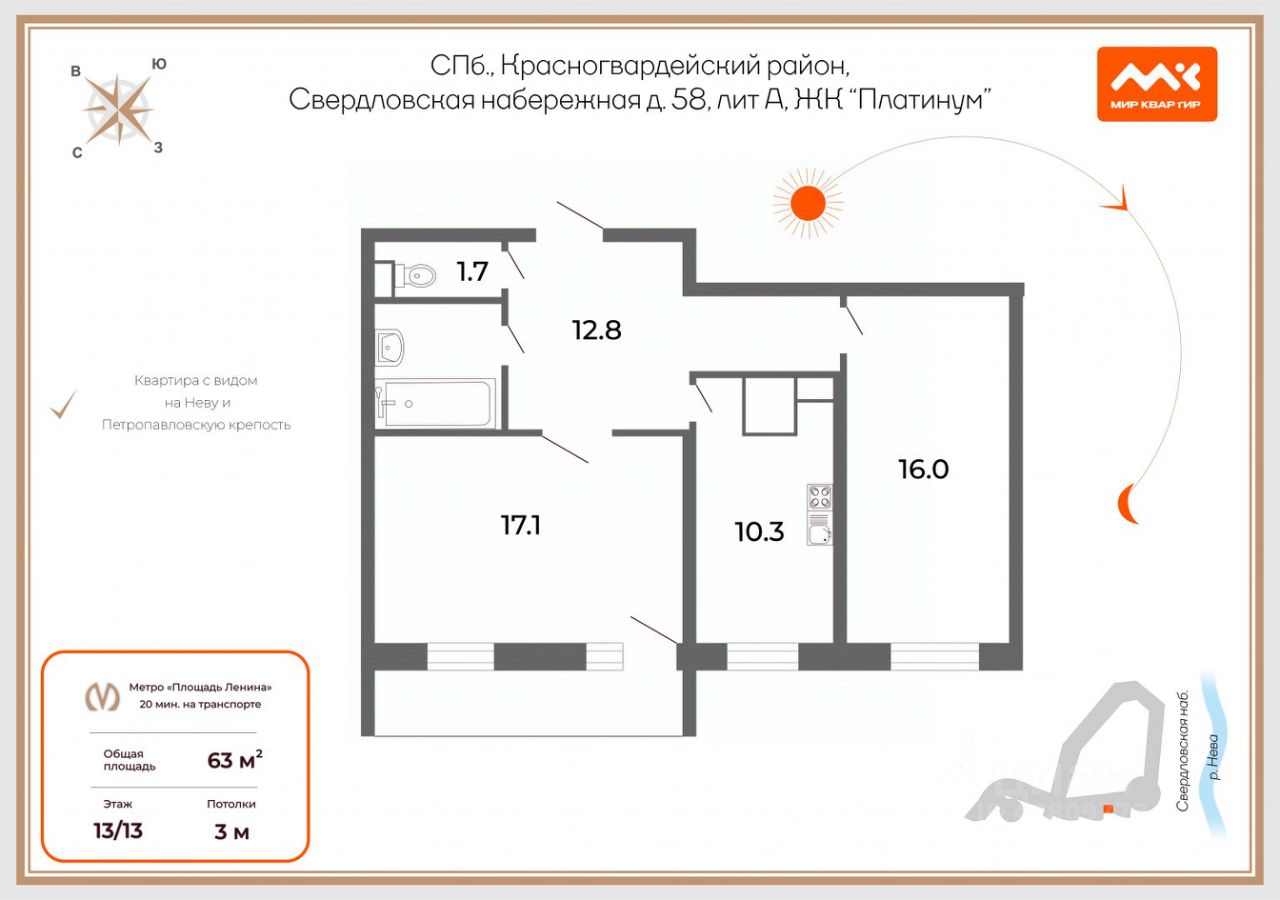 Арт. 127213607 Жить у воды — это особый статус! Продается уютная квартира с видом на Неву, Петропавловскую крепость и Лахта центр. Это не просто жильё — это стиль жизни, где каждый взгляд в окно дарит вдохновение.