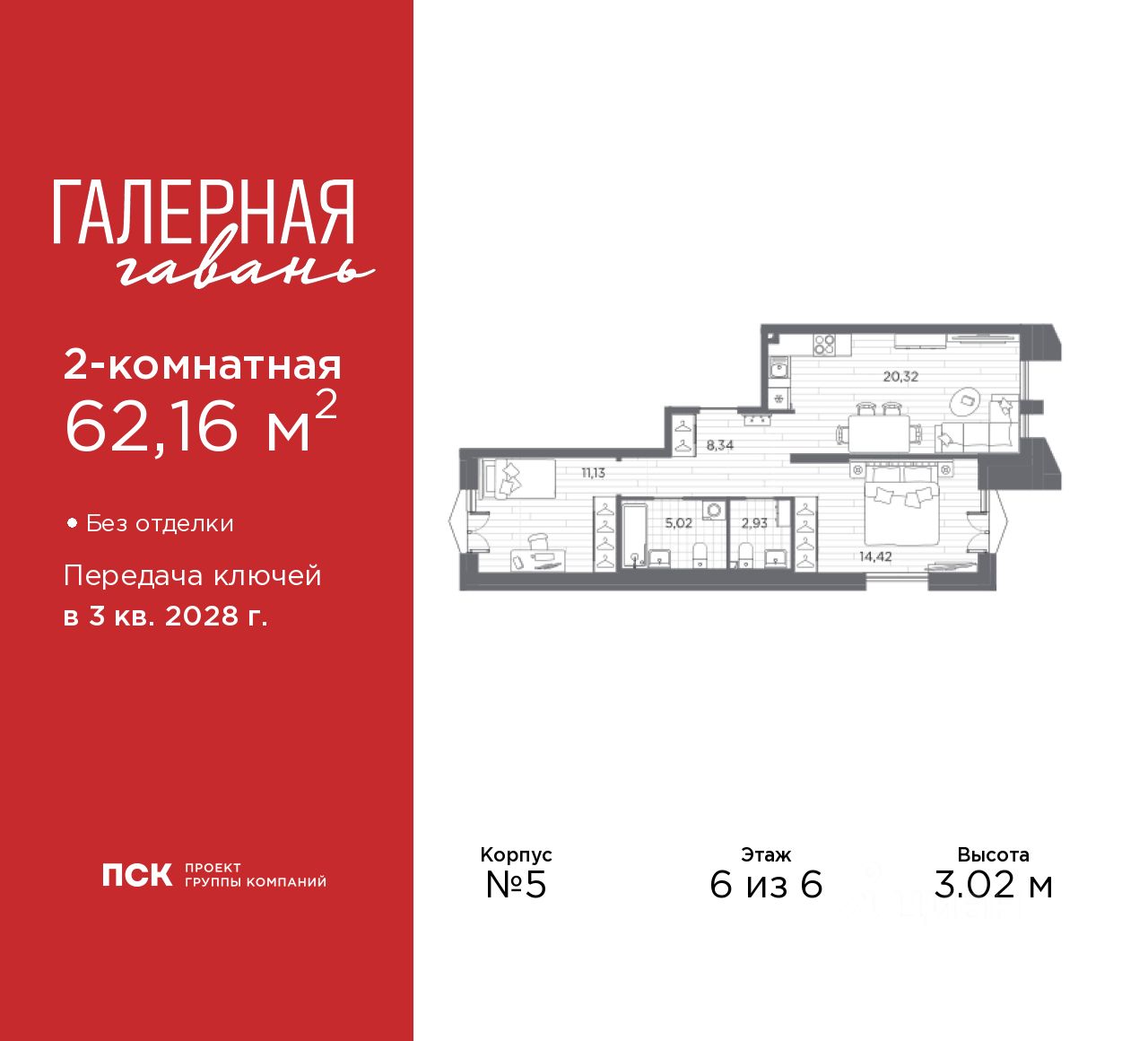 Просторная 2-комн. квартира в ЖК ''Галерная гавань'' на 6 этаже. Квартира без отделки, после оформления собственности можно делать ремонт. Общая площадь: 62.16 кв.м., жилая: 25.55 кв.м., площадь просторной кухни-столовой: 20.32 кв.м. Квартира без проходных комнат, окна выходят нa три cтopoны дома. В квартире один совмещенный и один раздельный санузел. Высота потолков 3.02 м.