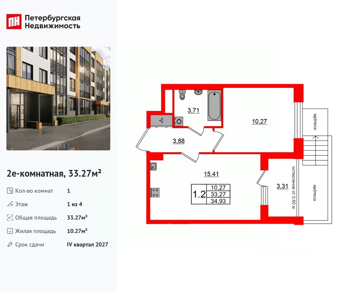 Удобная, классическая, функциональная европланировка, большая кухня-гостиная 15.41 м², вместительная прихожая 3.88 м². Общая площадь квартиры - 33.27 м², жилая 10.27 м², высота потолка 2.77 м.