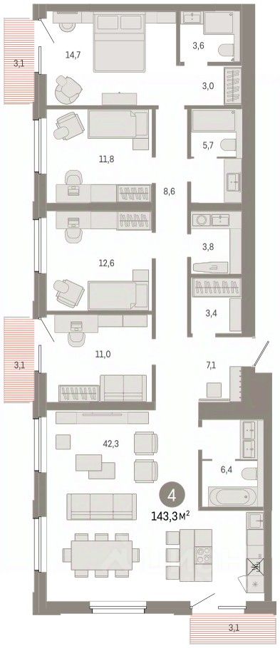 Квартира с кухней-гостиной и четырьмя спальнями в проекте Город-на-озере. Особенности планировки: второй санузел, мастер-спальня, предчистовая отделка, рабочий кабинет. квартиры в нашей базе: ГРД01-Ж1.4.4.