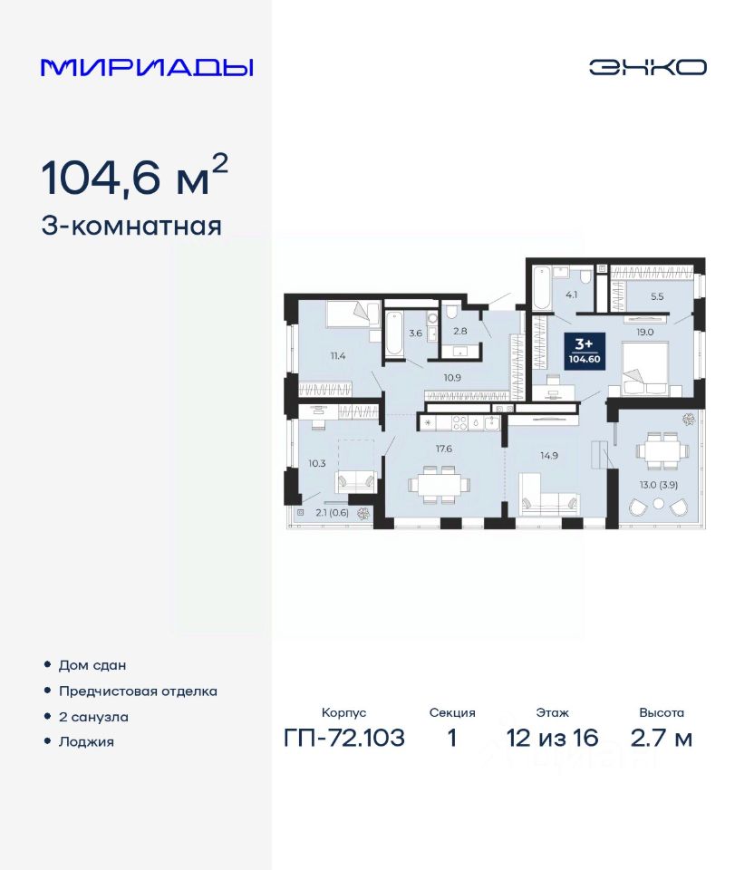 Просторная 3-комн. квартира с предчистовой отделкой в ЖК ''Мириады'' на 12 этаже. Общая площадь: 104.6 кв.м., жилая: 40.7 кв.м., площадь просторной кухни-столовой: 17.6 кв.м. Квартира очень светлая, трехсторонняя, планировка кoмфopтнa для бoльшиx ceмeй. В квартире две лоджии, два совмещенных санузла. Наличие в квартире террасы дает возможность для обустройства дополнительной площади. Высота потолков 2.7 м.