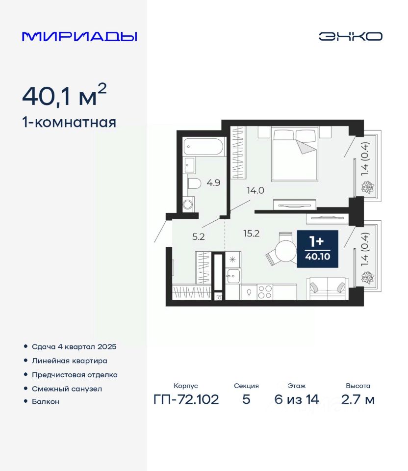Просторная 1-комн. квартира с предчистовой отделкой в ЖК ''Мириады'' на 6 этаже. Общая площадь: 40.1 кв.м., жилая: 14 кв.м., площадь просторной кухни-столовой: 15.2 кв.м. Все окна выходят на одну сторону. В квартире два балкона, один совмещенный санузел. Высота потолков 2.7 м.