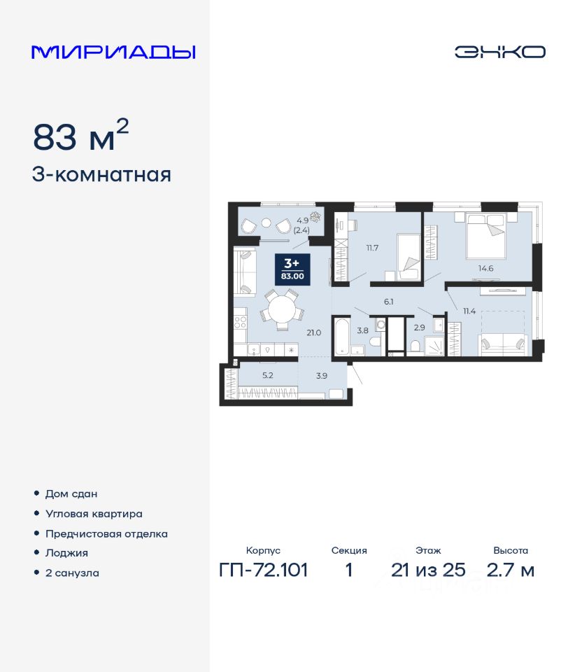 Трехкомнатная квартира от застройщика с предчистовой отделкой в ЖК ''Мириады'' на 21 этаже. Общая площадь: 83 кв.м., жилая: 37.7 кв.м., площадь просторной кухни-столовой: 21 кв.м. Угловая квартира, очень светлая, естественная вентиляция при открытии окон. В квартире одна лоджия, два совмещенных санузла. Высота потолков 2.7 м.