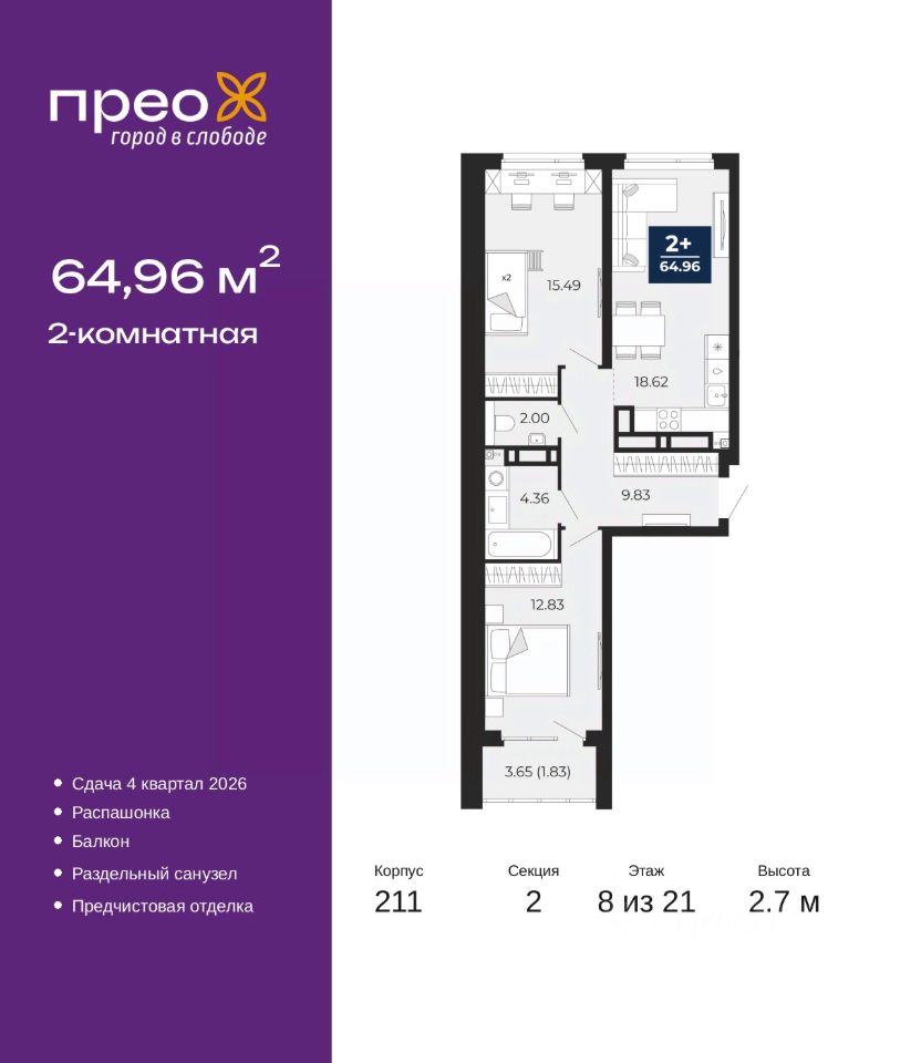 Продается 2-комн. квартира с предчистовой отделкой в ЖК ''Прео'' на 8 этаже. Общая площадь: 64.96 кв.м., жилая: 28.32 кв.м., площадь просторной кухни-столовой: 18.62 кв.м. Квартира - распашонка, без проходных комнат, окна выходят на paзные стороны дома. В квартире один балкон, один раздельный санузел. Высота потолков 2.7 м.
