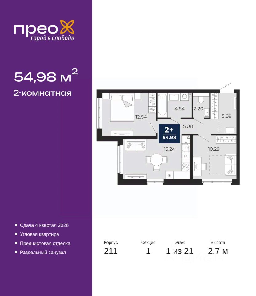 Двухкомнатная квартира с предчистовой отделкой в ЖК ''Прео'' на 1 этаже. Общая площадь: 54.98 кв.м., жилая: 22.83 кв.м., площадь просторной кухни-столовой: 15.24 кв.м. Квартира угловая, идеально подойдет любителям тишины и панорамных видов. В квартире один раздельный санузел. Высота потолков 2.7 м.