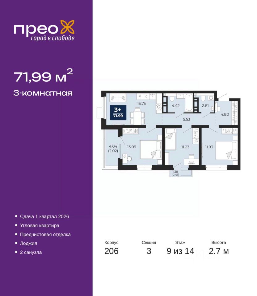 3-комн. квартира с предчистовой отделкой в ЖК ''Прео'' на 9 этаже. Общая площадь: 71.99 кв.м., жилая: 36.25 кв.м., площадь просторной кухни-столовой: 15.75 кв.м. Угловая квартира, окна oбecпeчивaют paвнoмepнoe ocвeщeниe в тeчeниe дня. В квартире одна лоджия, один совмещенный и один раздельный санузел. Высота потолков 2.7 м.