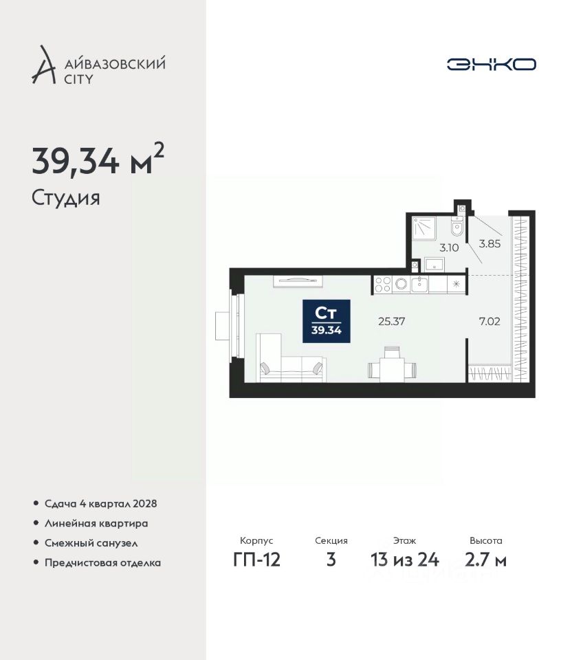 Продается 1-комн. квартира-студия от застройщика с предчистовой отделкой в ЖК ''Айвазовский City'' на 13 этаже. Общая площадь: 39.34 кв.м., площадь гостиной 26.37 кв.м., из которых 6 кв.м. выделено под кухонную зону. Все окна выходят на одну сторону. В квартире один совмещенный санузел. Высота потолков 2.7 м.
