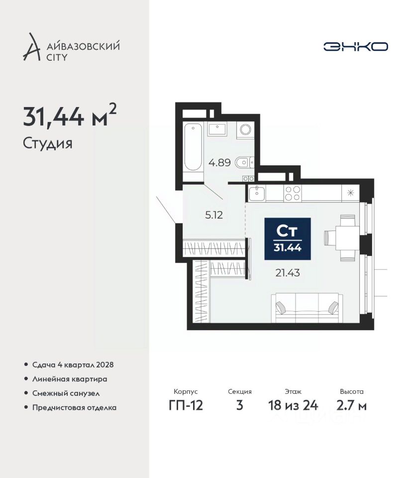 Просторная однокомнатная квартира-студия с предчистовой отделкой в ЖК ''Айвазовский City'' на 18 этаже. Общая площадь: 31.44 кв.м., площадь гостиной 21.43 кв.м., из которых 5 кв.м. выделено под кухонную зону. Все окна выходят на одну сторону. В квартире один совмещенный санузел. Высота потолков 2.7 м.