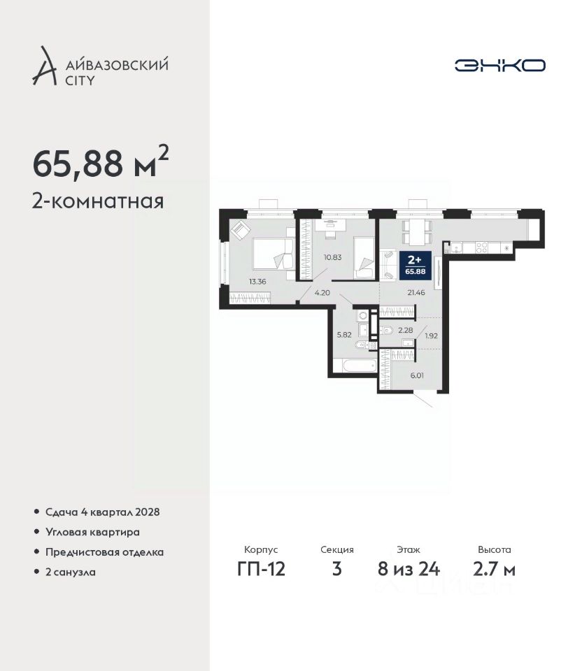 Двухкомнатная квартира с предчистовой отделкой в ЖК ''Айвазовский City'' на 8 этаже. Общая площадь: 65.88 кв.м., жилая: 24.19 кв.м., площадь просторной кухни-столовой: 21.46 кв.м. Угловая квартира, идеально подойдет любителям тишины и панорамных видов. В квартире один совмещенный и один раздельный санузел. Высота потолков 2.7 м.