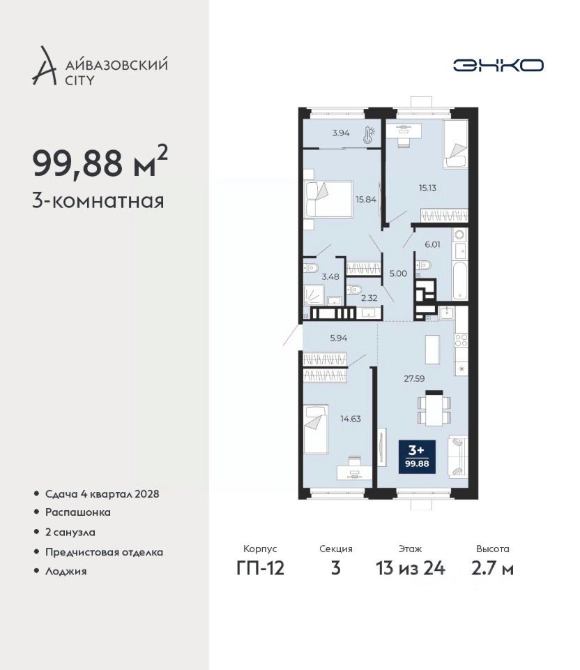 Продается 3-комн. квартира с предчистовой отделкой в ЖК ''Айвазовский City'' на 13 этаже. Общая площадь: 99.88 кв.м., жилая: 45.6 кв.м., площадь просторной кухни-столовой: 27.59 кв.м. Квартира - распашонка, без проходных комнат, окна выходят на paзные стороны дома. В квартире одна лоджия, два совмещенных санузла. Высота потолков 2.7 м.