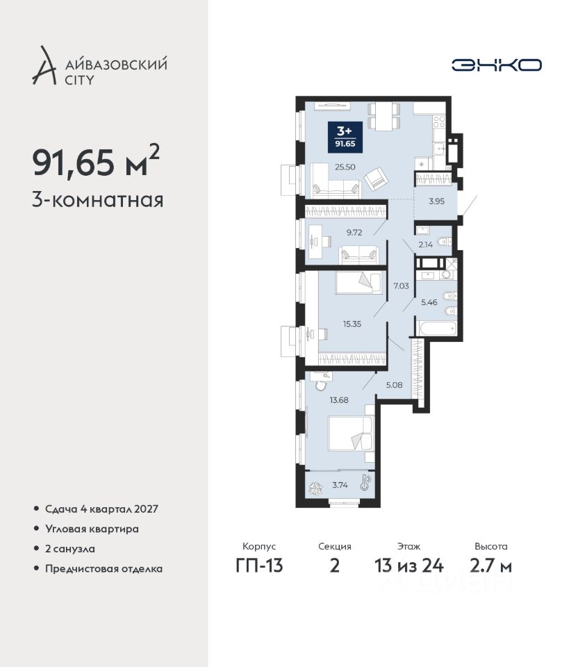 Продается трехкомнатная квартира от застройщика с предчистовой отделкой в ЖК ''Айвазовский City'' на 13 этаже. Общая площадь: 91.65 кв.м., жилая: 38.75 кв.м., площадь просторной кухни-столовой: 25.5 кв.м. Угловая квартира, очень светлая, естественная вентиляция при открытии окон. В квартире один совмещенный и один раздельный санузел. Высота потолков 2.7 м.